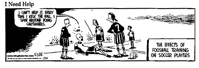 - I Need Help (12K): cartoon strip, from 1/30/1999. From the same cartoonist who came up with a reporter interviewing a tired looking Ghandi on the shoreline, while Ghandi quips, "the ascetic life style is hard, my feet are calloused from walking barefoot, and my meagre diet leaves me weak with hunger and bad breath." The caption: "Super calloused fragile mystic plagued with halitosis."