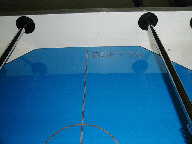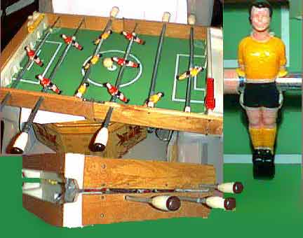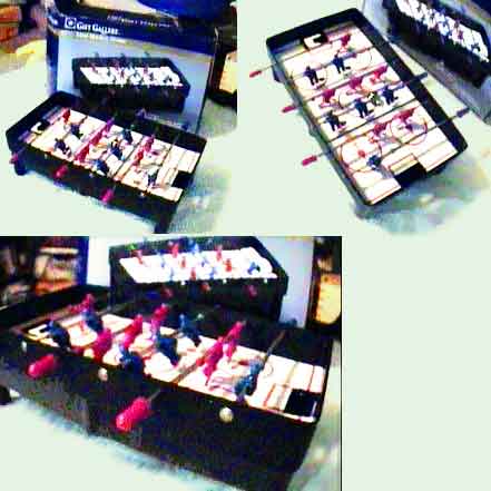 - Miniature Table Hockey, Foosball-type (21k) found on ebay, 1:2:3:3:2:1 configured. Note the two separate legs on each man, and the hockey-circle markings on the white ice-colored playfield. Foosball tables in Spain also have two-legged men like this. (7/99)