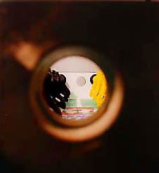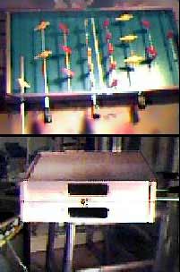 - Yugo Foosball (21K): New York artist Kevin O'Callaghan recently had a show where he remade junked Yugo automobiles into art.. he turned them into, pianos, confessionals, toasters, portopotties, and of course a foosball table. See his art show here. My art crit interpretation is that the grey and white foosmen in the stands are the "new generation" of players from Premier Soccer, a Tournament-soccer clone, watching in the audience the older Tournament-Soccer players (aka million-dollar)... in the future, the audience grows up to be like their idols. A motif for early 80's foosball.