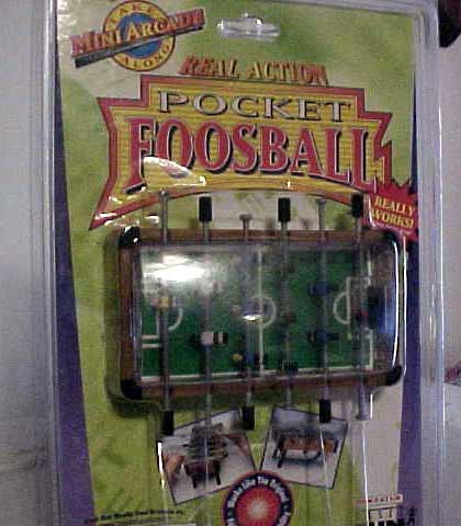 - Miniature Foosball Two: Pocket Foosball (27k) Also from an auction on ebay 5/99, it's pictured still in plastic wrap. Note the picture on the product with the hands playing foosball, indicating the true scale. Wow, it's tiny. 1:2:3:3:2:1 setup.