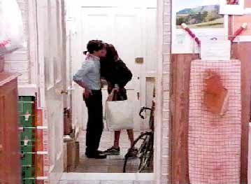 - Notting Hill Kiss From the film. Hugh Grant and Julia Roberts kiss in the doorway. In the crowded, untidy hallway is stowed a foosball table top in the vertical position. I'll bet you didn't notice that! See the video clip as they kiss!