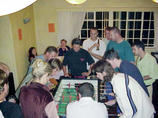 People actually playing miniature table-soccer in earnest (78K) These are my friends Tim and Pauline at a fondue party in my apartment in Honolulu. It's only a one-bedroom apartment, and about 25 people are here! They're playing amid drinks and fondue burners on my coffee table, and yes, two people really going at it in miniature.